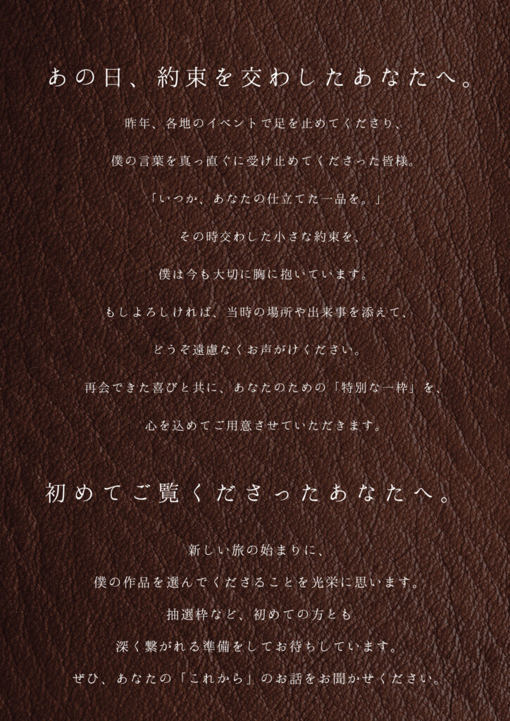 現在、Gypsy Leather Worksのオーダーは、昨年のイベントにてお話が進んでいる方を数え、極めてありがたいことに「2027年以降」まで埋まっております。
