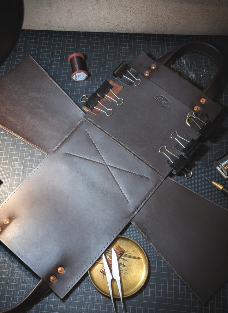 セミオーダーは、会場にあるS/M/Lのトートバッグやクラッチバッグをベースに、革の色、糸、金具、底鋲など、あなたの人生という旅にふさわしいカスタムを施すものです。